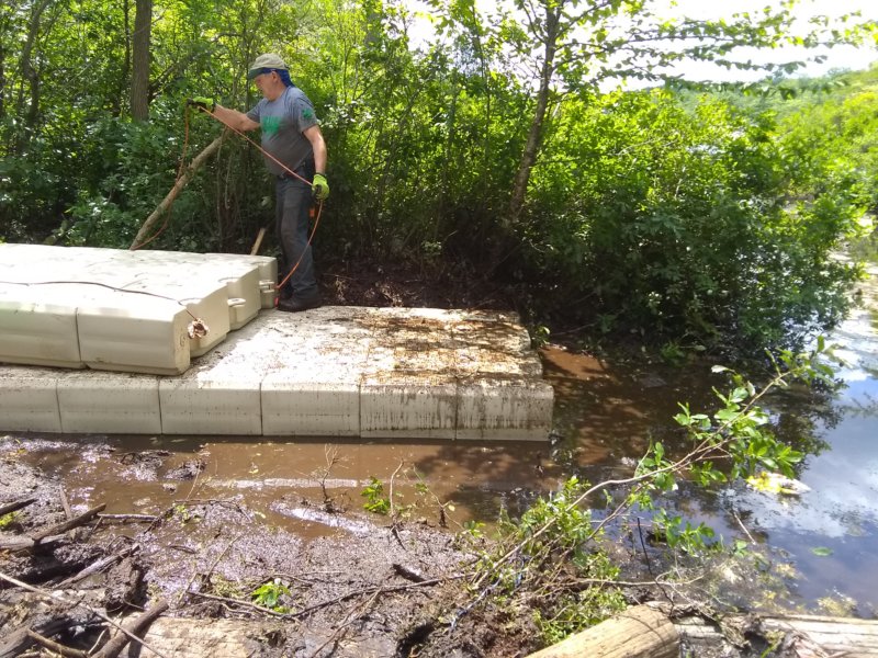As we progressed, sometimes the only way to deal with the waterlogged junk was to get a noose on one end of it, and then cut it off beyond the walkway. Sawing submerged logs is really not recommended best treatment of a saw; but it got the job done, and the saw survived.