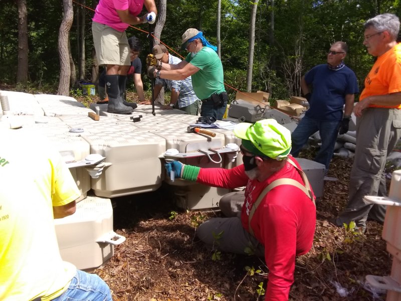 Now we begin the assembly of the walkway's components. The first unit we assembled was the near-end "platform". This would be where hikers would arrive via a gangway, so it was about double the size of the rest of the walkway's sections.