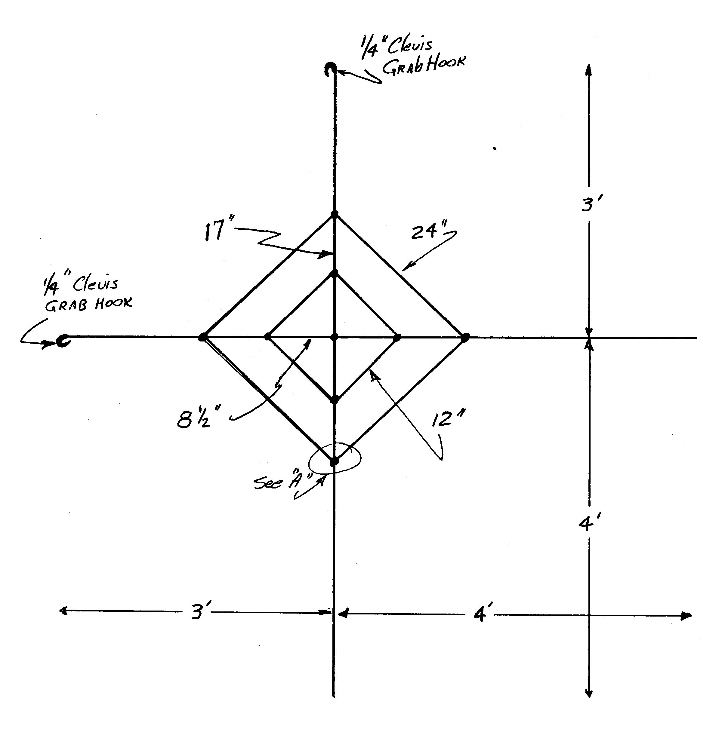3. The inner net ‘ring’ should have 12” long sections fastened to the cross chains 8.5” from the center.  It is made from the 4’ piece of chain.  Don’t overlap the ends, just fasten them on adjoining links.