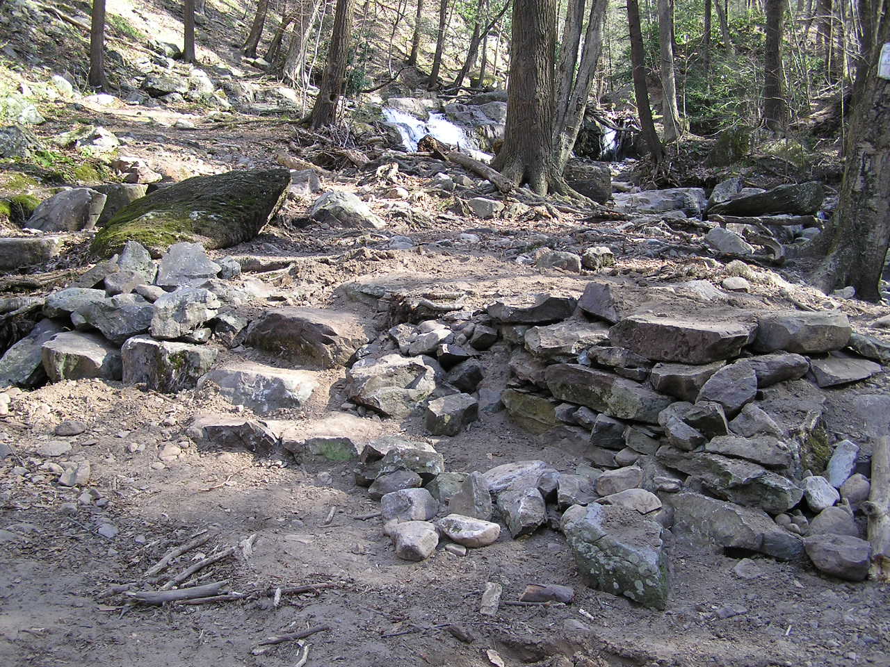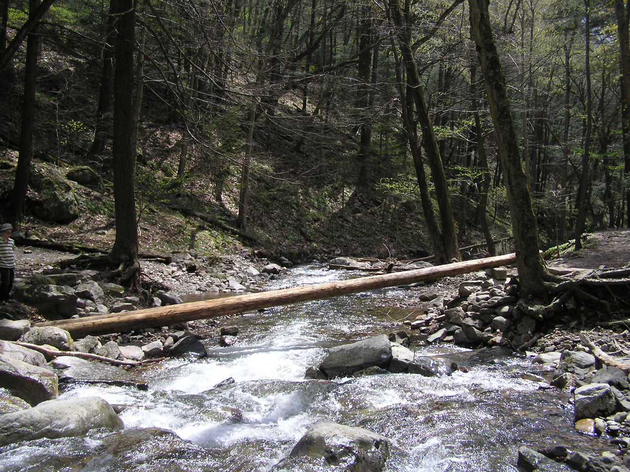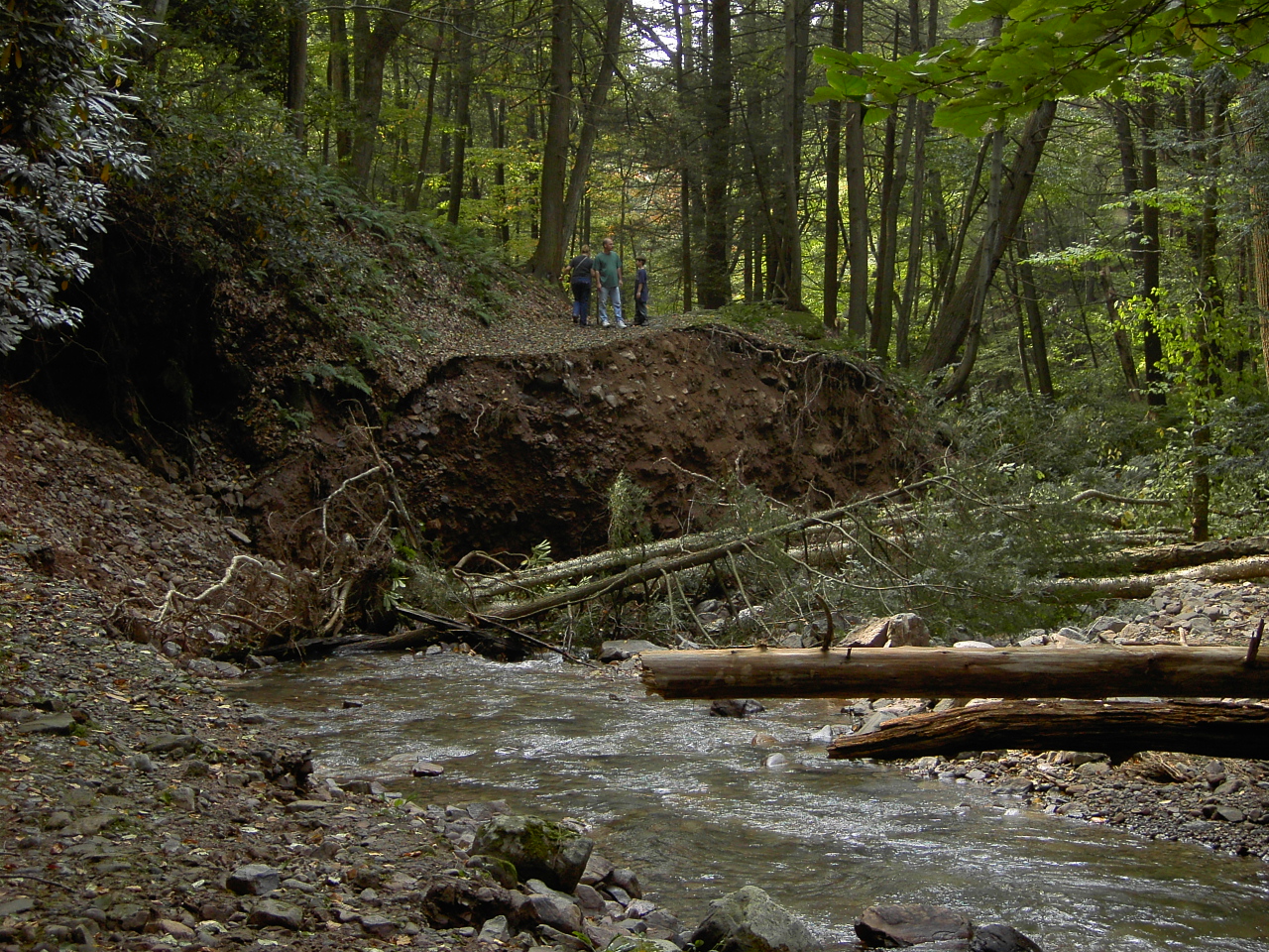 In the Fall of 2004, a cell from Hurricane Ivan dropped over 12" of rain in 2 hours on the ridge-top in Worthington State Forest where Sunfish Pond and an unnamed beaver bog are situated.  The bog is the headwater for Dunnfield Creek, which flows down the glen; eventually passing under I-80 and joining the Delaware River.  Given the thin soil and steep rocky walls of the glen, the flood waters came fast and furious, taking rocks, trees and all six foot bridges with it; actually creating a delta in the river!  It also moved and deepened the bed of the stream in several places.