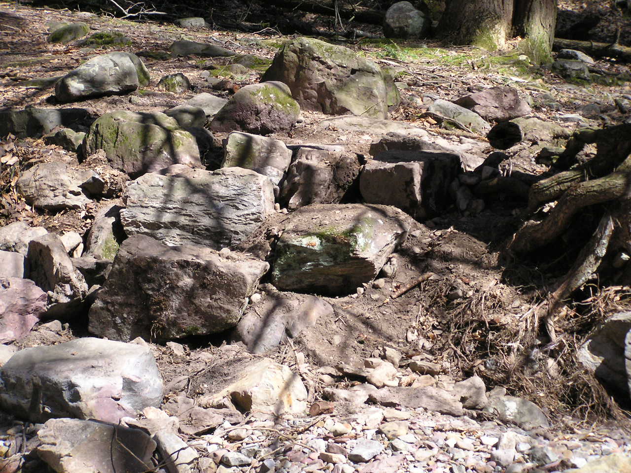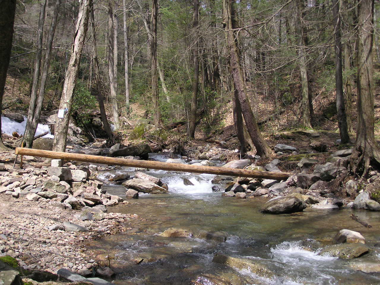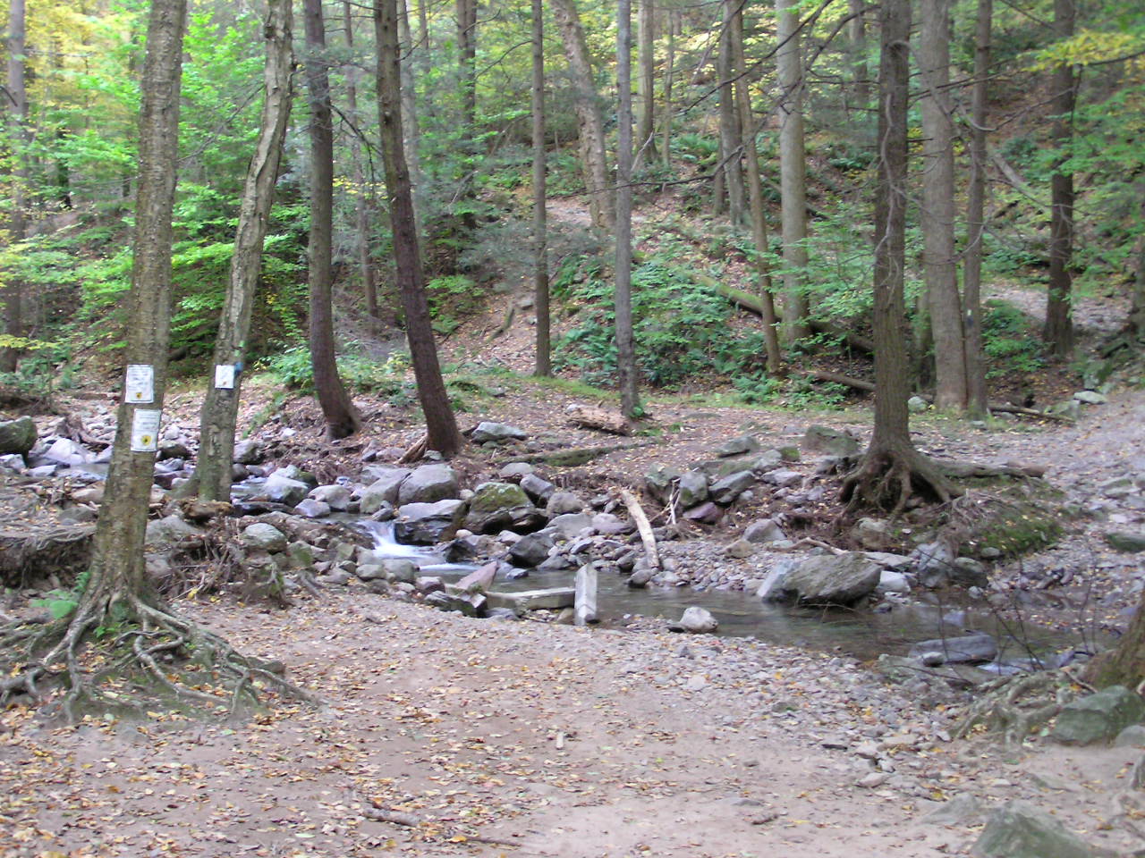 In the Fall of 2004, a cell from Hurricane Ivan dropped over 12" of rain in 2 hours on the ridge-top in Worthington State Forest where Sunfish Pond and an unnamed beaver bog are situated.  The bog is the headwater for Dunnfield Creek, which flows down the glen; eventually passing under I-80 and joining the Delaware River.  Given the thin soil and steep rocky walls of the glen, the flood waters came fast and furious, taking rocks, trees and all six foot bridges with it; actually creating a delta in the river!  It also moved and deepened the bed of the stream in several places.