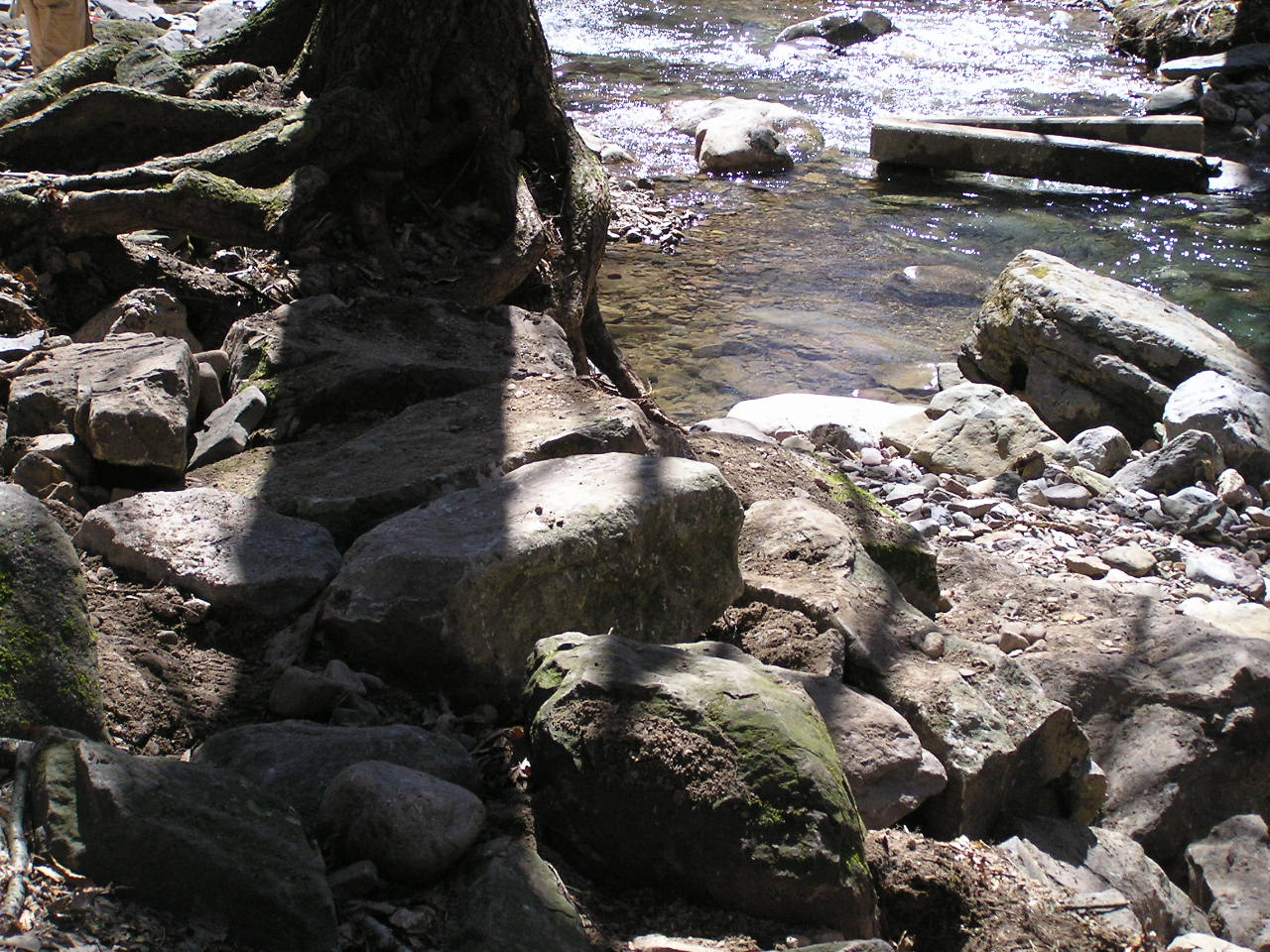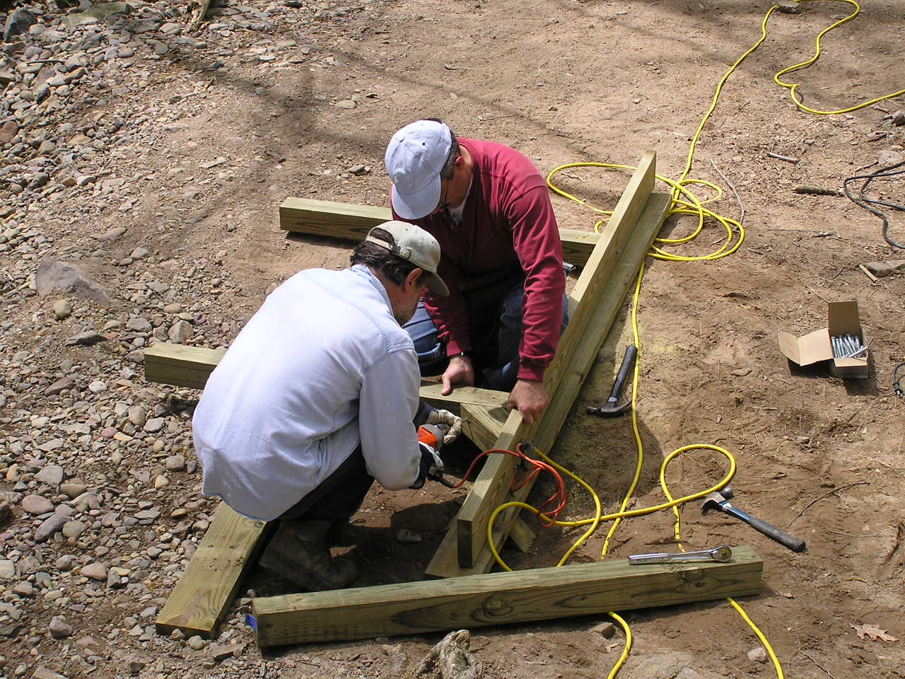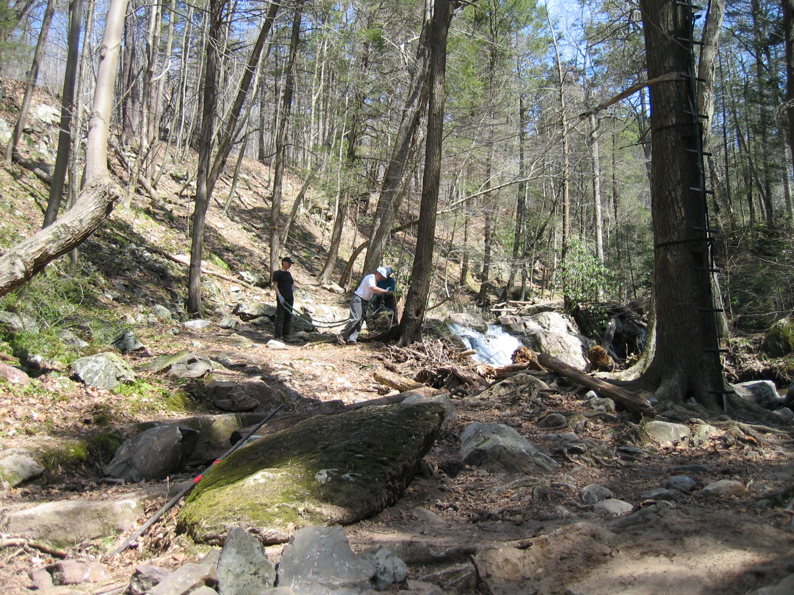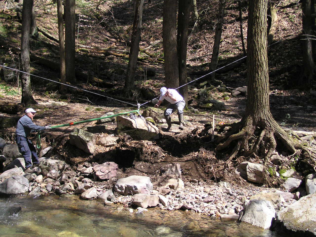 While all the rock-shopping was going on, Monica lead a contingent which began to excavate for the new footings on the eastern (far) side bank. In this photo, Roland and David are positioning what will be one of the base rocks of that abutment. Steve and Roland had teased this one out of the hill about 75 feet away and 30 feet up. At around a half ton, it should make a good base!