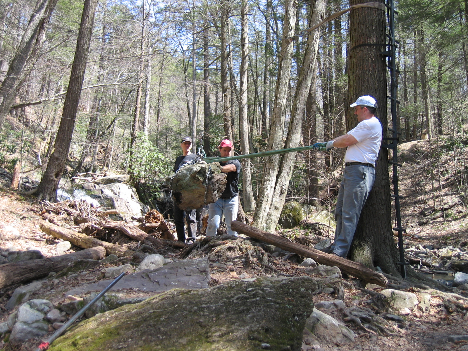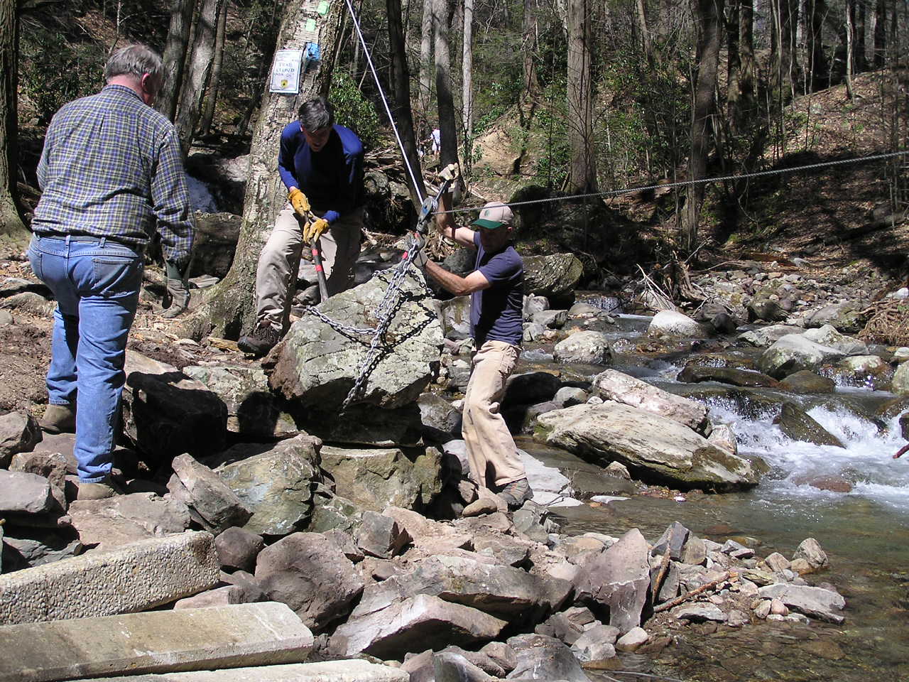 Using a Grip-Hoist with an overhead steel cable as a zip-line, we "floated" multiple tons of rock from around the area and made a stockpile near the site of the new bridge. Here, Andreas pushes, while David pulls; with Larry in the background, lining up the next rock to be moved.