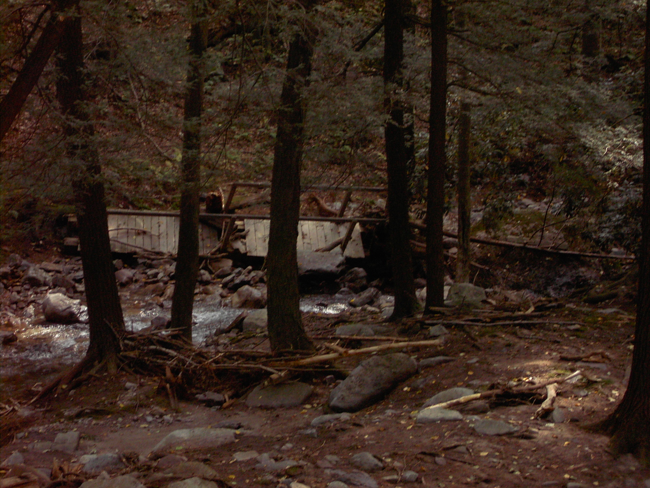 This photo, taken by a passing hiker shortly after the Hurricane shows one of the more recognizable remainders.  We believe that this used to be the forth bridge, the wreckage was just upstream of the third bridge. So far, it is the only bridge that was not, apparently, smashed to smithereens by the flood waters.