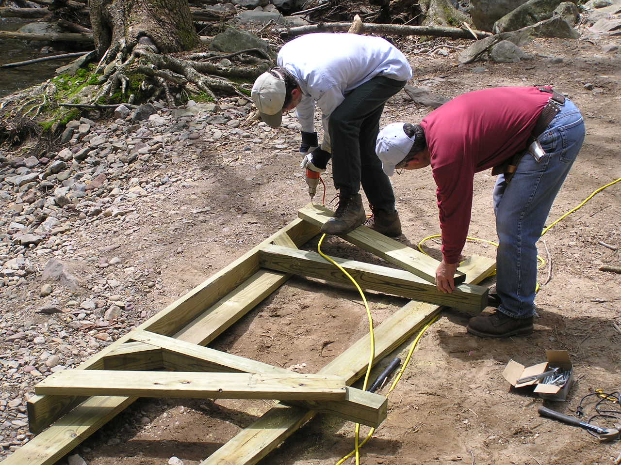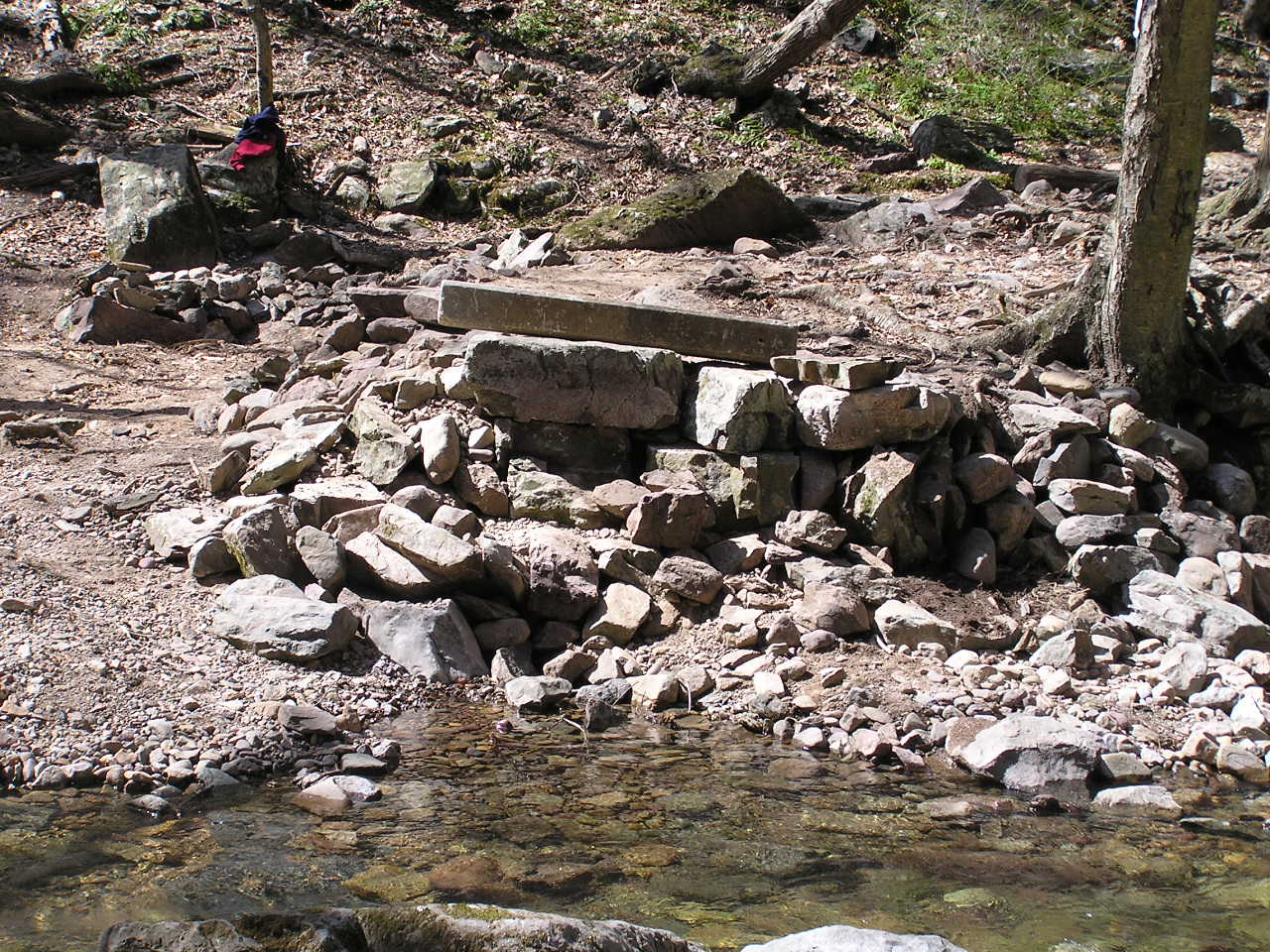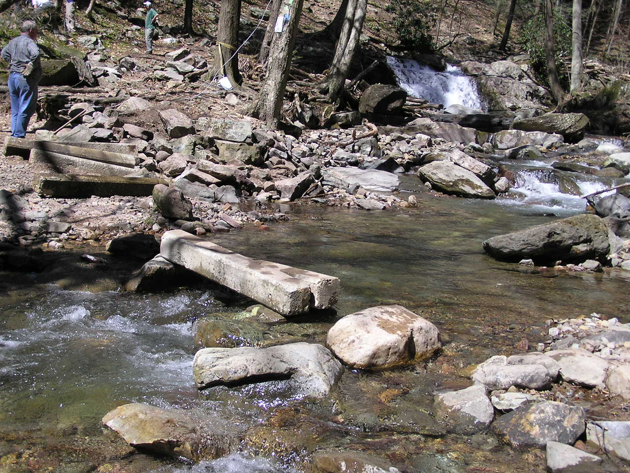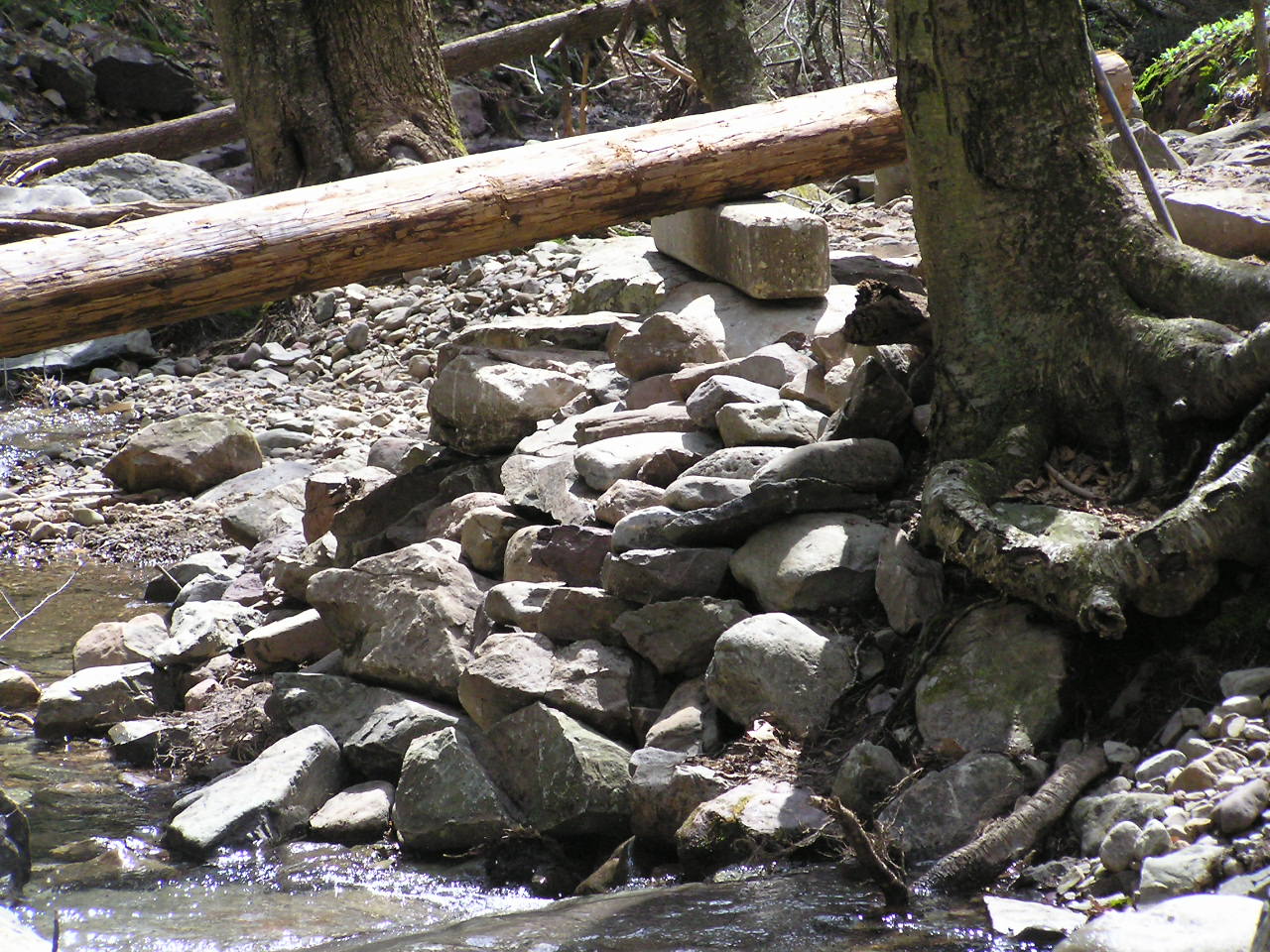 One of the first steps was to pull out the old concrete beams which had been the footing timbers for the old bridge. We used a couple of them to build a make-shift crossing so that we (and the many hikers) could get across the now 3-foot deep channel.