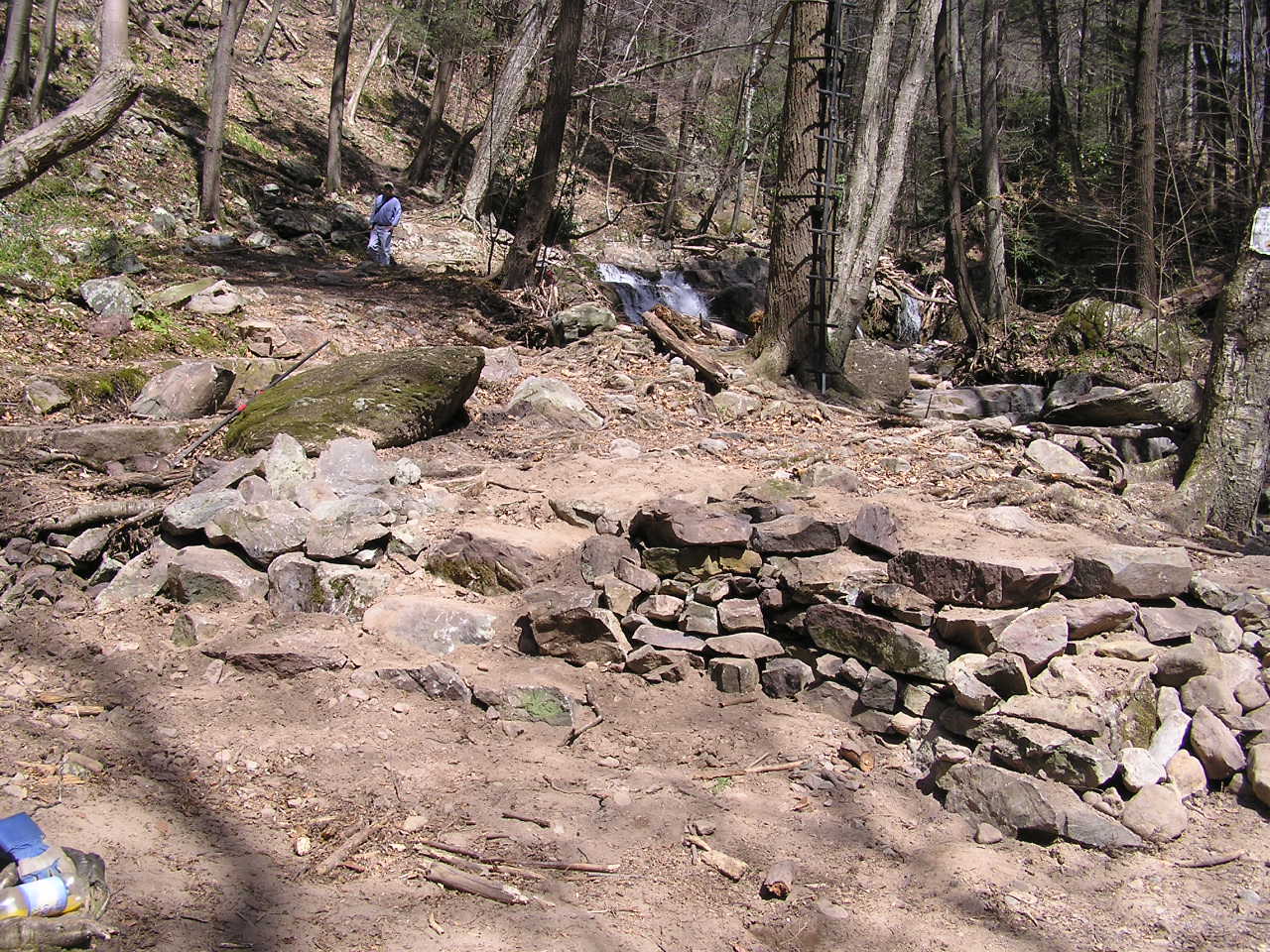 Part of the work on the near side was to build up a series of retaining walls which would create a wide enough area for people to walk on as the approach and leave the new bridge. A set of stone steps would also have to be built into the wall structure to permit hikers to easily climb up to the top of the wall and the pathway. The area was a badly eroded backwater area with lots of roots exposed. We had to dig around and then build out beyond the roots; trying to keep them to help hold the existing bank together.