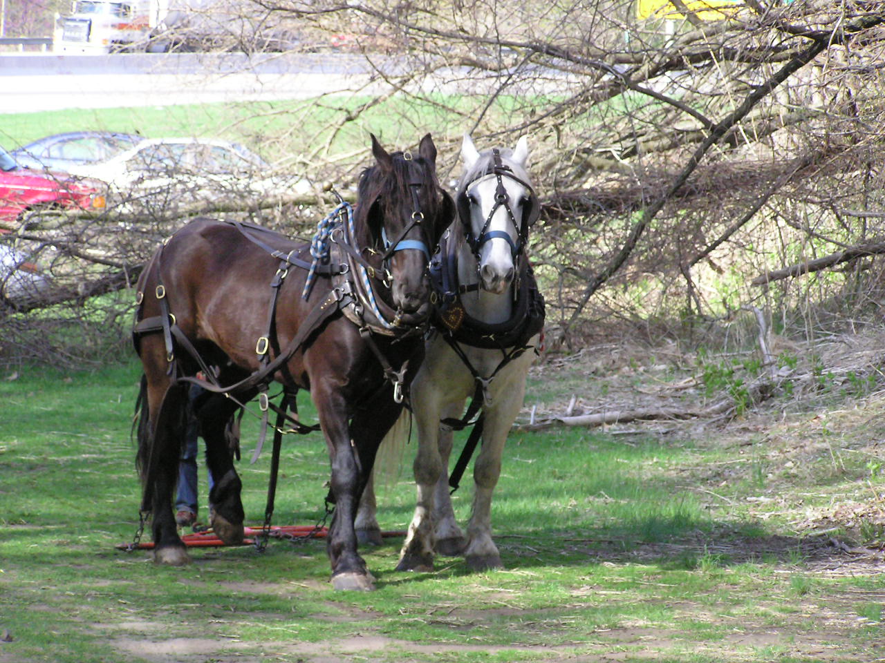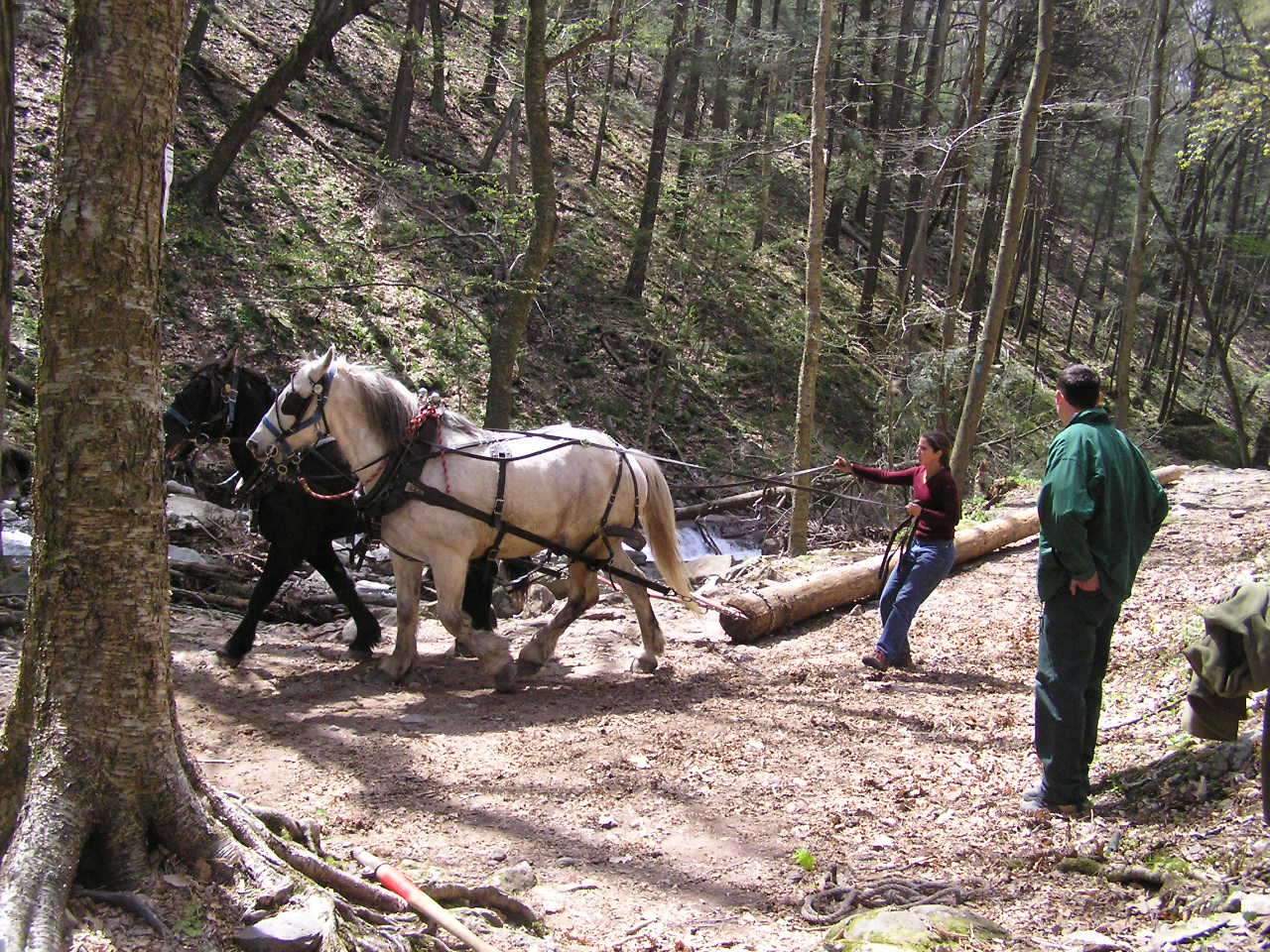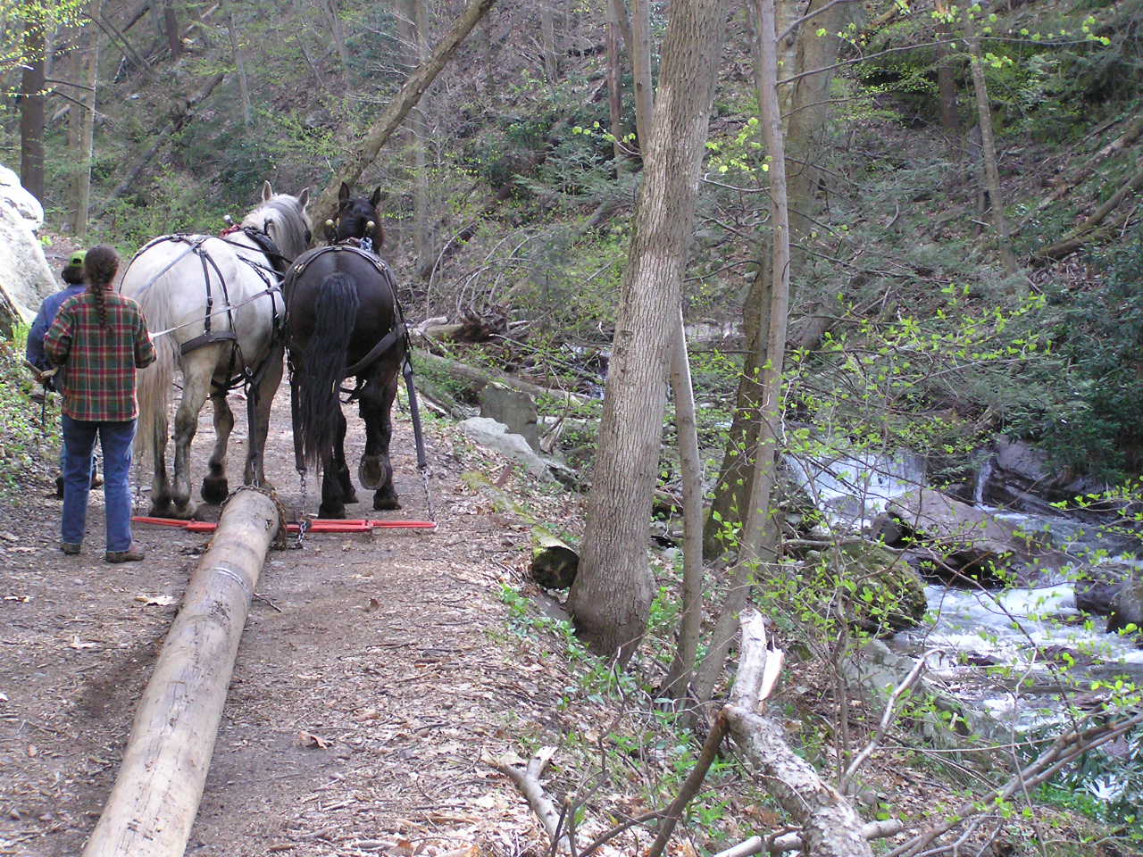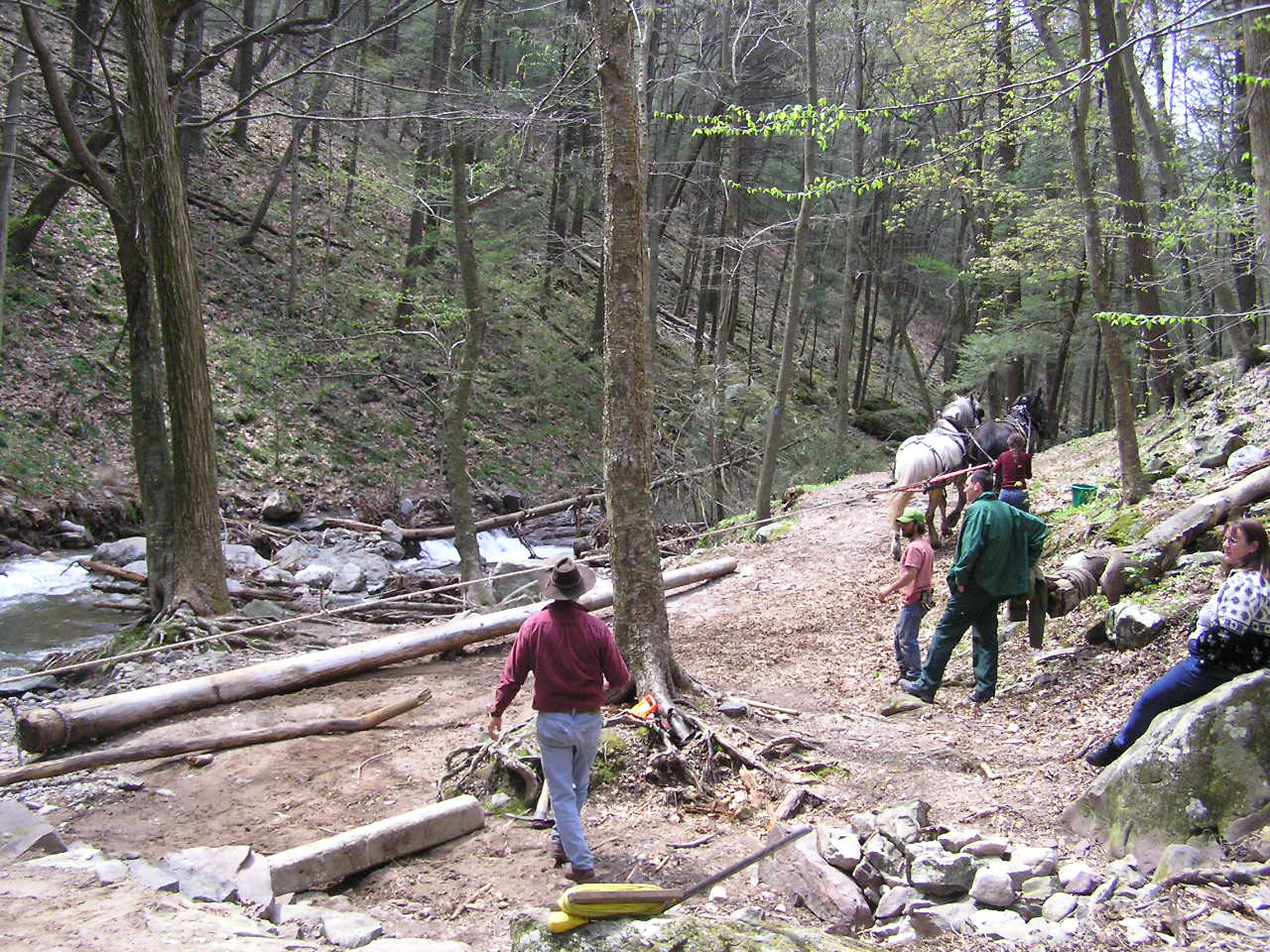 There was one small detail we had to deal with. The main bridge supports were two 36 foot telephone poles. And they were out at the side of I-80 in the overflow parking area - half a mile from their intended new home. Send for the Calvary - or more precisely, for Josh and Tom. They are two of 4H Timber Harvesters' (Pipersville, PA.) Percheron draft horses. As they did for us on the Big Flat Brook bridge, they provided the "horsepower" needed to move those poles right up to the site.