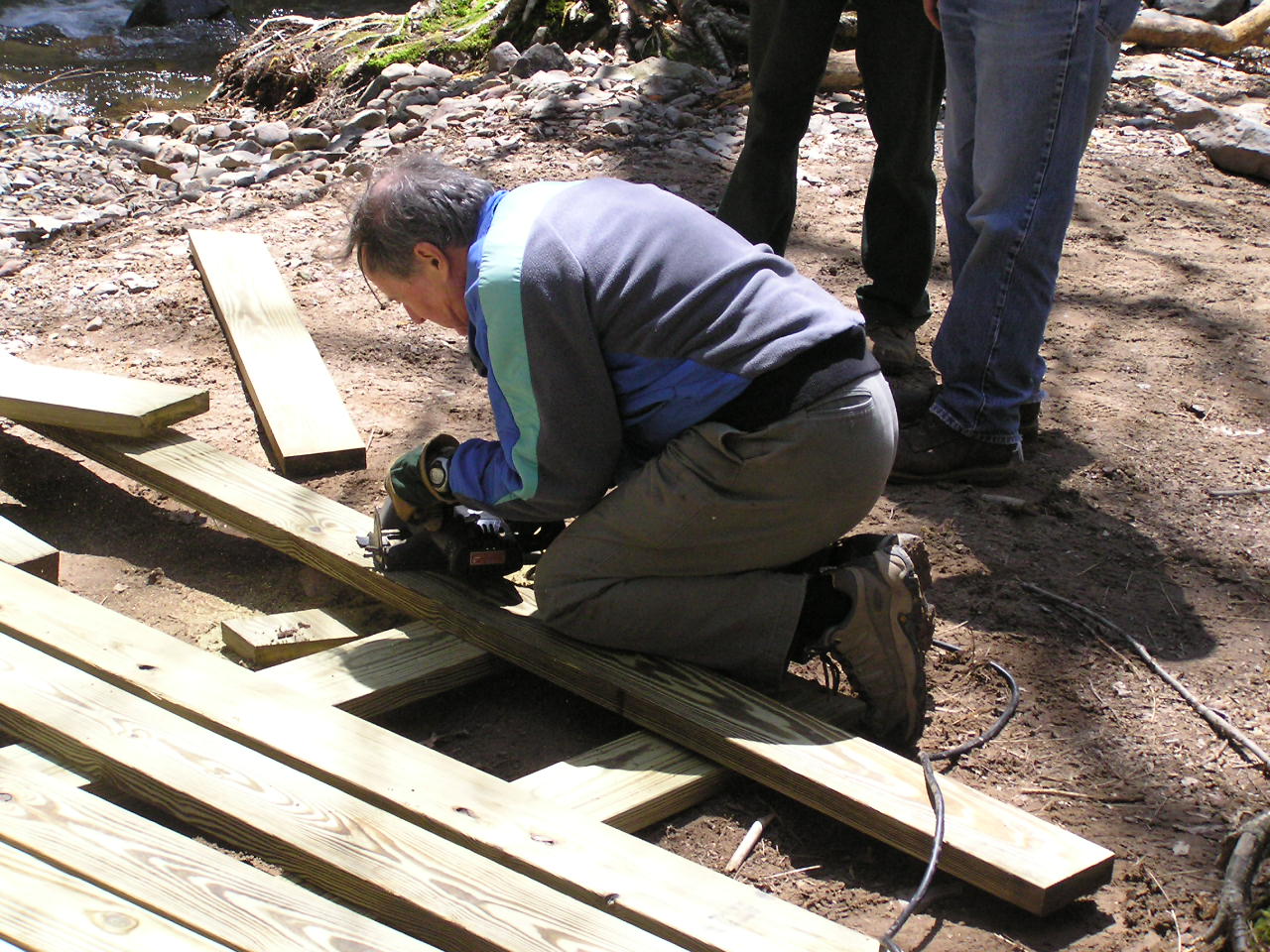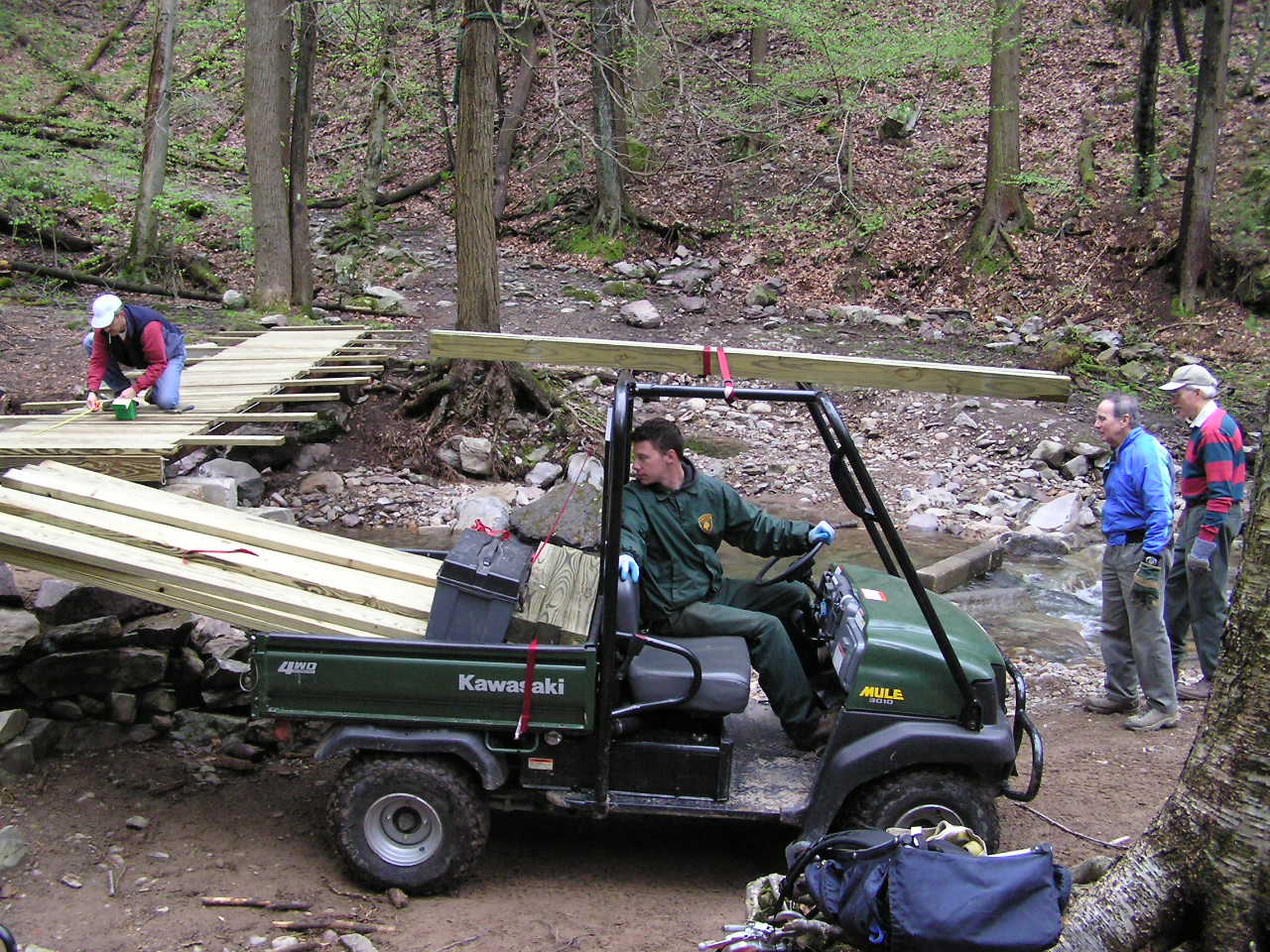 The next trip began with a split effort. Part of the crew worked at the parking lot where the lumber had been delivered. Using a chop saw, they pre-cut most of the wood components to size. Then, using a motorized "Mule", the materials were brought in over multiple trips. Thanks to the staff at Worthington for once again providing super support for the project. One of them spent the entire day working with us.