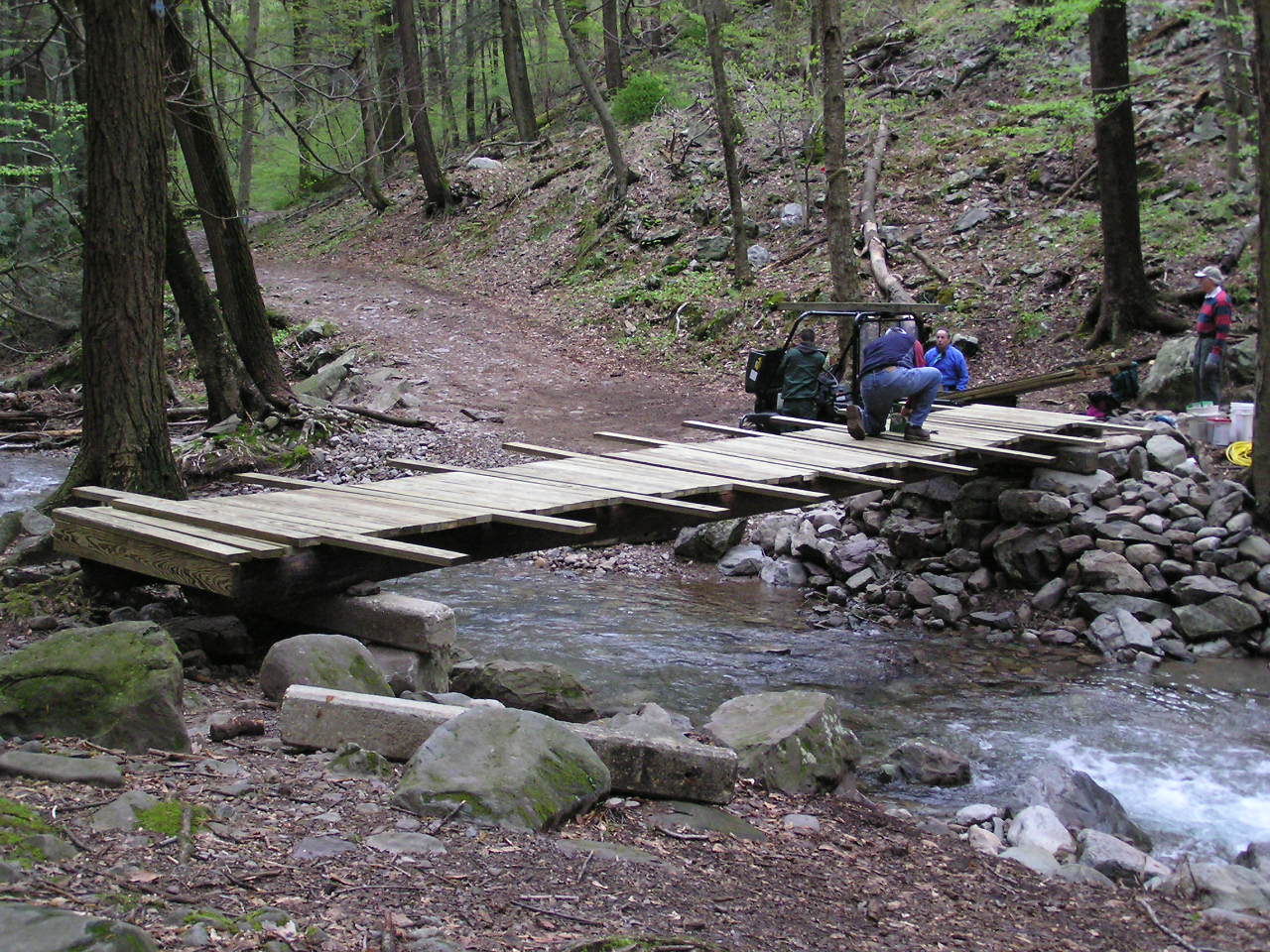 On the second trip, the North Jersey Crew joined us for the day. Work began on the western (near) side abutments working from the stockpiled materials from the previous day. Here folks from both crews are working to move another big rock into place.