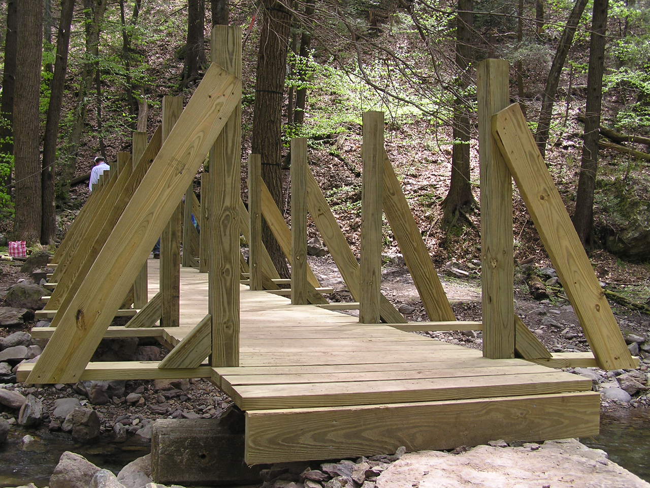 Then the whole assembly is carried onto the bridge, set in place and screwed down. This photo gives you a pretty detailed view of just how the whole thing goes together. This is a very common style of bridge, commonly called "Adirondack" style.