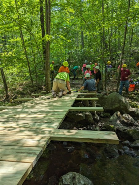 Then the full-length deck planks are laid down roughly in place, so the deck boards can be laid out between them to insure even spacing for everything. (Lumber sizing is so sloppy, you can't rely in pieces being all the same dimension - right from the mill!)
