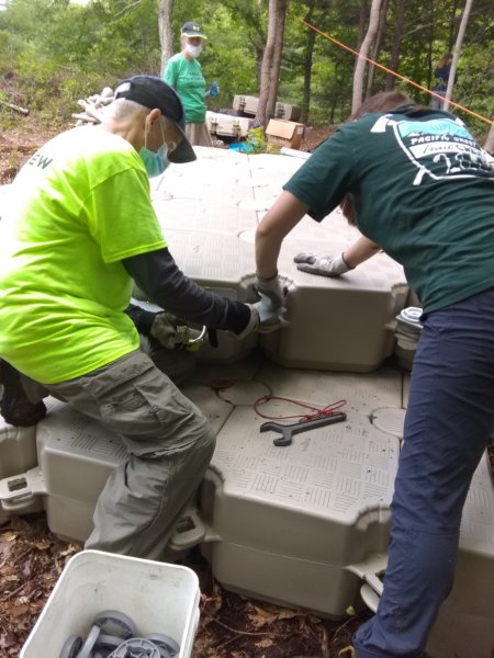 Here is the final location of the platform. The 4-foot bridge spans the root system of the tree (a beautiful, strong, oak that nobody wanted to hurt). By using a single row of cubes and the bridge, we didn't have to create havoc with the tree's roots. It does result in an awkward-looking offest, but there really wasn't any other option. And, once everything is in place, it turns out it really doesn't impact the walkway.