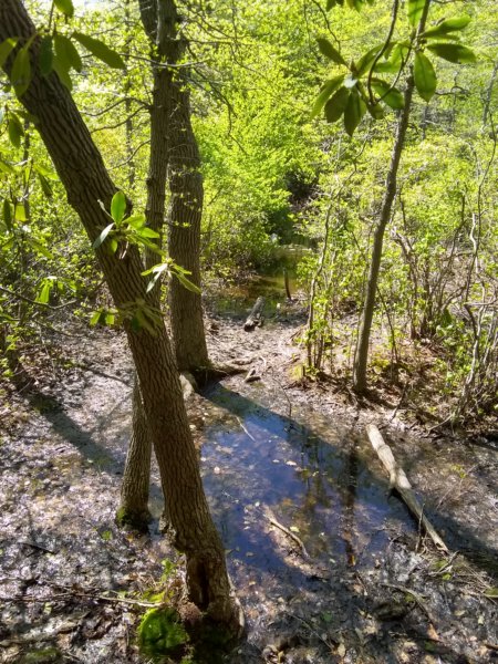 Standing as far into the crossing as possible, this is the view back toward the Western approach. In the very foreground, you can see the notched log that had once been part of a long-since-gone attempt at bridging this mess.