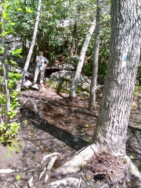 After climbing down a steep rock face, you arrive at "The Outlet". Over 100 feet away is where you need to get to.